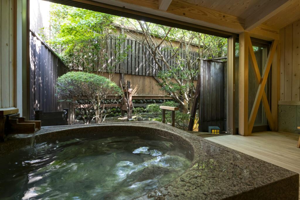 2つのベッドルームと独立した2か所の洗面・お手洗いを備え、プライベートな寛ぎを大切にした設え。専用の露天風呂では、自然の気配を感じながら心ゆくまで湯浴みを愉しめます。シャワールームも完備し、快適さと上質さを兼ね備えた、当館ならではの最上級の滞在をお約束いたします。