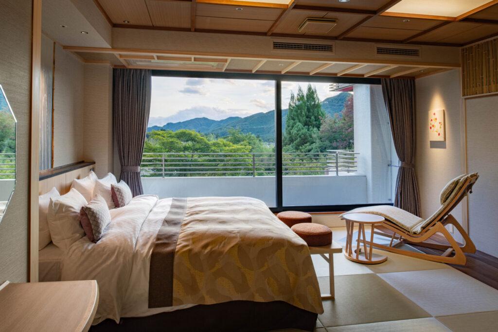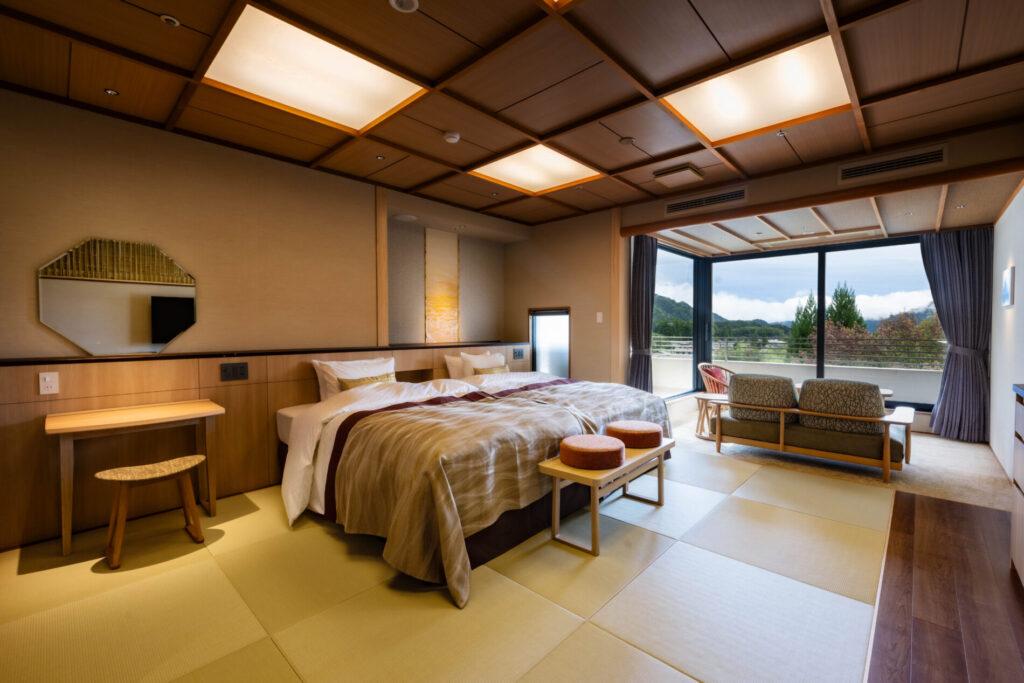 和にこだわった設えでありながらお休みはシモンズ製ベッドを導入し